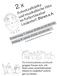 Die Schnitzelbankgruppe des FC Büren, der Venner-Spiegel, Roger Steiner sowie das Duo „Blue Canoe“ (1. Januar) und die Musikgruppe Pan y Viento (09. Januar) werden erneut für einen humorvollen und fetzigen Jahresauftakt sorgen